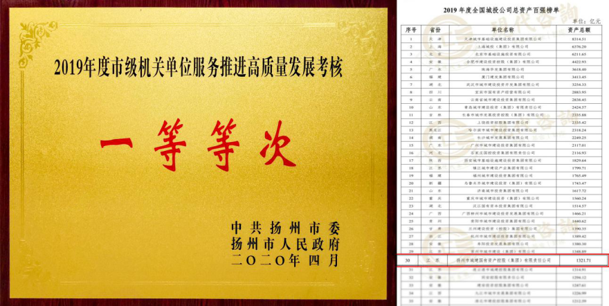 城控集團綜合實力躋身全國城投企業(yè)30強。集團“綠色循環(huán)經(jīng)濟產(chǎn)業(yè)鏈”獲2020年度保爾森可持續(xù)發(fā)展獎提名,成為揚州市唯一入選該獎項的項目。集團被表彰為2019年度市級機關(guān)績效考評“一等等次”單位,并連續(xù)三年獲得一等等次。