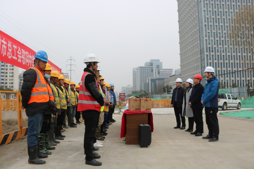 2月5日下午,揚州市總工會副主席洪慧娟一行來到潤揚路快速化改造工程施工現(xiàn)場,看望慰問春節(jié)留揚務(wù)工人員。