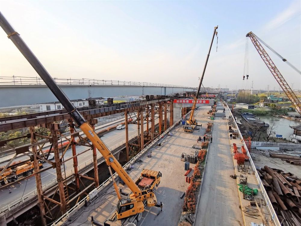 運河南北路快速化改造二期工程(萬福西路—物港路北)全線采用高架式快速路斷面,總長2.73公里,標(biāo)段范圍內(nèi)包含運河南北路高架、萬福路互通樞紐和全線地面道路。高架主線橋上部結(jié)構(gòu)大部分采用現(xiàn)澆預(yù)應(yīng)力混凝土連續(xù)箱梁,在運河北路與古運河交界處,設(shè)計在原夫差橋上方進行施工架設(shè),平行上跨新建230米左右幅三跨連續(xù)鋼箱梁,雙向10車道,是揚州快速環(huán)路中唯一一座平行上跨新建的“橋上橋”。其中,鋼箱梁施工采用的是搭設(shè)高空施工平臺,將鋼箱梁吊運至平臺上拼裝,然后頂推到位的方法施工。