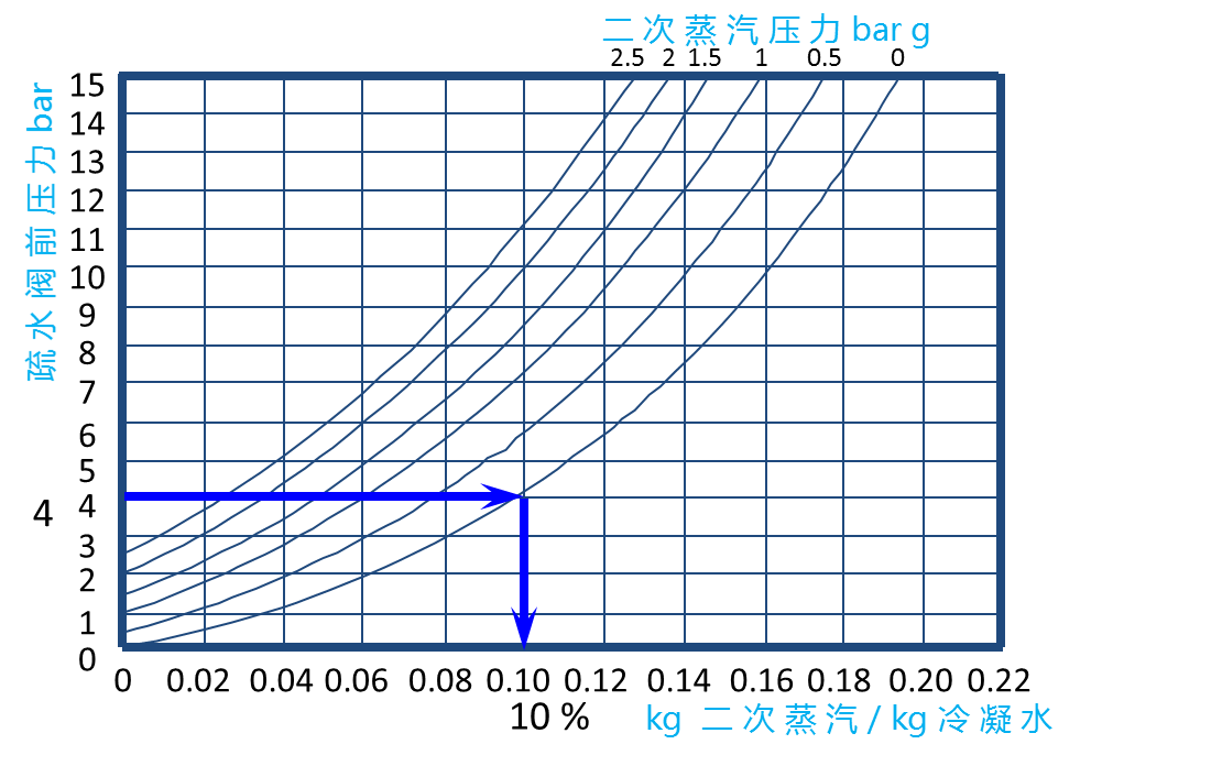 冷凝水壓力越大,二次蒸汽壓力越低,可回收利用的熱能就越多,如下圖可知,當冷凝水壓力(及疏水閥前壓力)達到4bar,二次蒸汽壓力為大氣壓時,閃蒸率為10%: