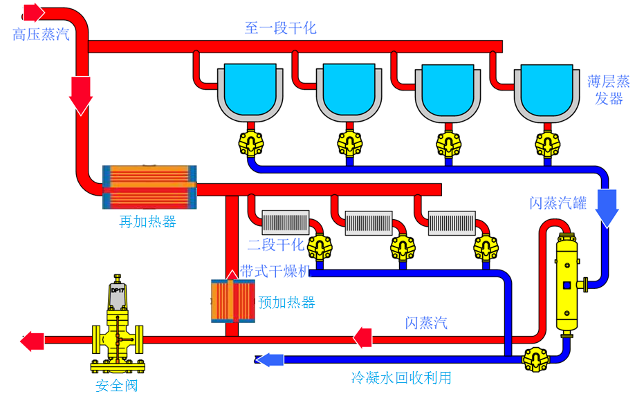 來自薄層蒸發(fā)器的疏水閥排出的高溫、高壓冷凝水全部進入閃蒸罐進行閃蒸分離,產生的閃蒸蒸汽進入預加熱器,預加熱器對帶式干燥機內循環(huán)空氣進行加熱,當溫度不能滿足生產要求時,開啟再加熱器對循環(huán)空氣進行再次加熱。閃蒸罐分離后的冷凝水通過底部疏水閥與預加熱器排出的冷凝水匯合后排入現(xiàn)有蒸汽冷凝水箱。閃蒸罐上設置安全閥,當系統(tǒng)異常,安全閥打開泄壓。
