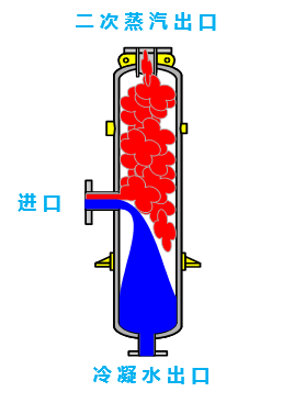 閃蒸罐是一種重要的節(jié)能裝置,常用于蒸汽凝結水的余熱回收。凝蒸汽結水沿閃蒸罐切線進入罐內,根據流體兩相流和渦流分離理論,在罐內擴容后,壓力降低,在罐內產生閃蒸汽,引入低壓蒸汽管道,進入再加熱器,對循環(huán)空氣進行加熱,使原來低品質的熱能重新得到利用。聚集在下部的飽和凝結水流入,經疏水閥后流到凝結水罐。