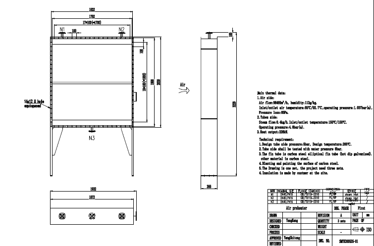 1 | 預加熱器 | 按現(xiàn)場接口、尺寸要求進行訂制。殼程:熱空氣,98489m3/h,溫度<92℃;管程:蒸汽,0.4kg/h,溫度<150℃,壓力<4.8bar | 凱絡文、雙木、林德 | 臺 | 1 |