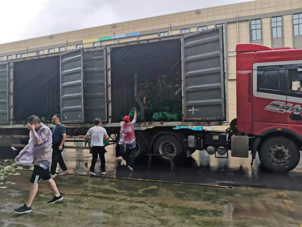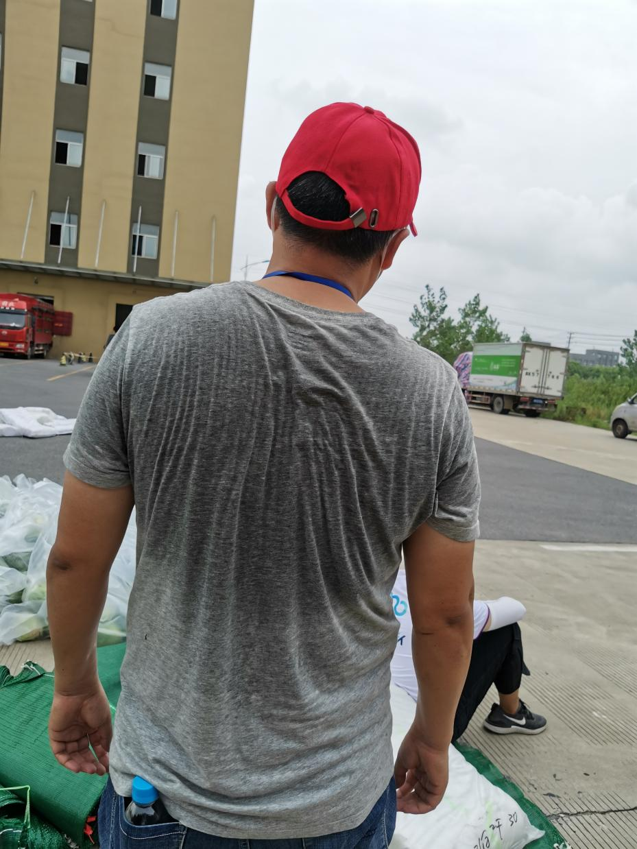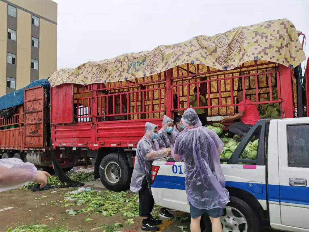 14:30,天空開(kāi)始飄起雨點(diǎn),大家依舊堅(jiān)守在各自的崗位上,很快雨點(diǎn)就打濕了衣服和頭發(fā),可現(xiàn)場(chǎng)沒(méi)有一個(gè)人退下躲雨?!斑@車卸得差不多了,我們?nèi)ツ沁厧兔Α?,“邗江區(qū)轉(zhuǎn)運(yùn)蔬菜的車來(lái)了,需要10個(gè)人裝車”,“我去”“我也去”,現(xiàn)場(chǎng)只有時(shí)不時(shí)這樣的聲音傳來(lái)。