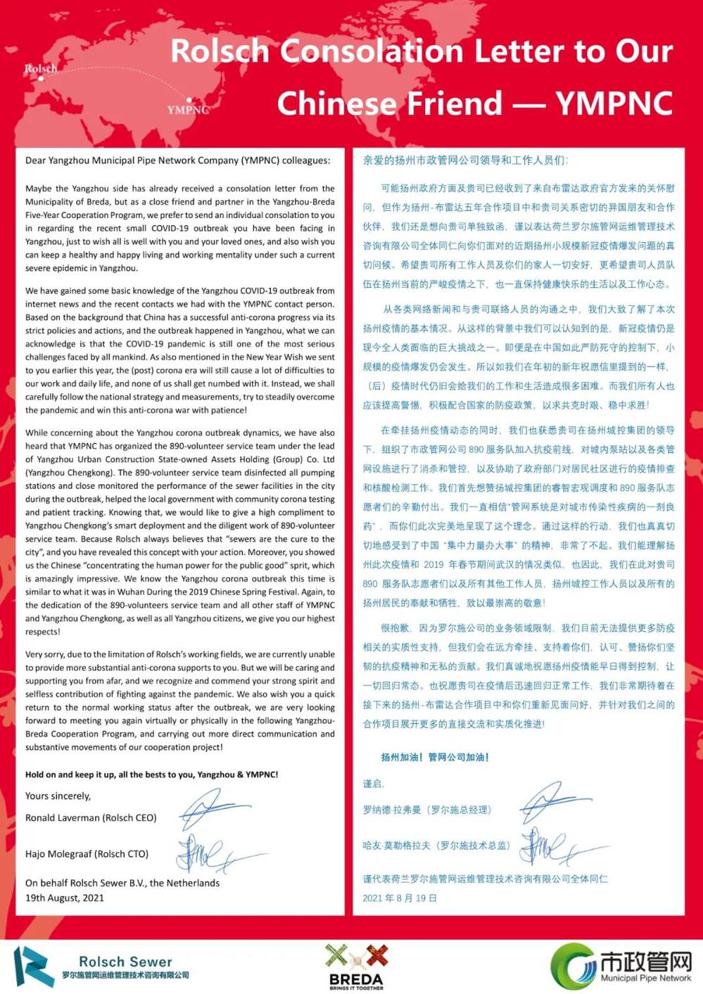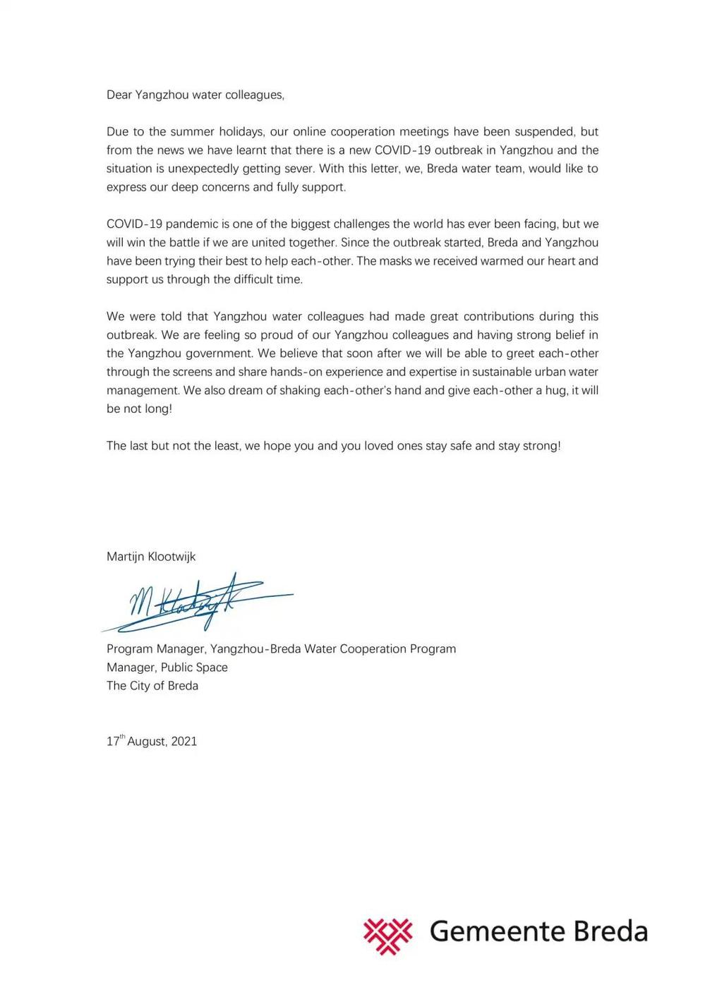 8月18日,在我市新冠肺炎疫情防控的攻堅(jiān)時(shí)刻,城控集團(tuán)收到荷蘭布雷達(dá)市公共空間和水務(wù)局以及羅爾施管網(wǎng)運(yùn)維管理技術(shù)咨詢有限公司發(fā)來的暖心慰問函。信函中,布雷達(dá)市公共空間和水務(wù)局局長(zhǎng)馬丁·科洛威先生以及羅爾施管網(wǎng)運(yùn)維管理技術(shù)咨詢有限公司總經(jīng)理羅納德·拉弗曼先生對(duì)我市正在蔓延的新冠肺炎疫情表示關(guān)切;向身處疫情中的廣大城控集團(tuán)員工及家人表示誠摯的問候,對(duì)“890管網(wǎng)服務(wù)隊(duì)”代表的“城控”抗疫志愿者奮戰(zhàn)“疫”線的擔(dān)當(dāng)精神,致以崇高的敬意。這封遠(yuǎn)隔重洋飛馳而來的慰問信,彰顯了兩座城市間彌足珍貴的友誼,也增強(qiáng)了“城控人”打贏這場(chǎng)疫情防控阻擊戰(zhàn)的信心。