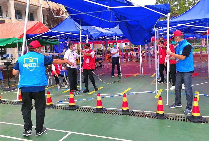 9月2日清晨,天空陰云密布。早6時(shí)許,第三組26名志愿者全部到達(dá)檢測地點(diǎn)——朱自清小學(xué),大家按照分工職責(zé),各就各位,忙著核酸檢測前的準(zhǔn)備工作。“今天有雨,請志愿者抓緊時(shí)間再檢查一下帳篷和支架……”季紅軍提醒道。6:30,檢測順利開始;7:35,小雨不期而至;7:45,大雨傾盆而下,很快,雨水順著風(fēng)向在帳篷凹陷處形成積水,積水越來越多,幾名志愿者拿出早已準(zhǔn)備好的木棍,找好角度,用木棍將積水推出,并不時(shí)提醒居民注意安全。光伏公司志愿者蘇峰強(qiáng)忍腰疾,和大家一起全然不顧全身濕透,如此反復(fù)直至8:30雨水漸止,確保了核酸檢測順利進(jìn)行。