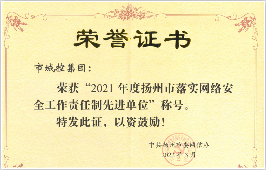 近日,城控集團(tuán)由于在網(wǎng)絡(luò)安全工作責(zé)任落實(shí)方面成績(jī)突出,被市委網(wǎng)信辦表彰為“2021年度揚(yáng)州市落實(shí)網(wǎng)絡(luò)安全工作責(zé)任制先進(jìn)單位”。