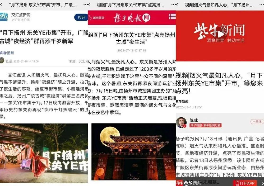 熱鬧集市異彩紛呈,吸引游客紛至沓來(lái),點(diǎn)亮揚(yáng)州古城夜經(jīng)濟(jì),這也引發(fā)了多家媒體的關(guān)注與報(bào)道,包括多家國(guó)家級(jí)媒體、省市級(jí)媒體以及揚(yáng)州本地自媒體。