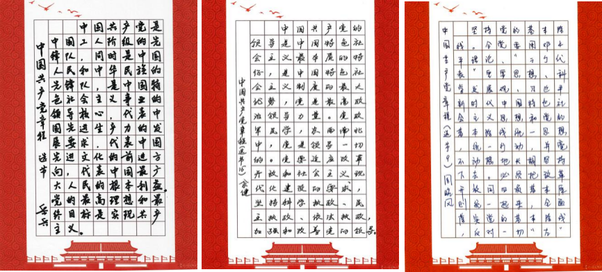 文字入手、意識入腦、責任入心。支部黨員利用工作之余,以《中國共產(chǎn)黨章程(修正案)》為藍本,堅持一筆一畫工整書寫黨章,一字一句銘記黨章條款,熟悉掌握黨章主要內(nèi)容,深入領(lǐng)會黨章內(nèi)涵、精神實質(zhì)以及對共產(chǎn)黨員的職責要求。全體黨員抄黨章、學黨章、悟黨章,內(nèi)外一心,共同在抄寫中提升黨性,鑄造黨魂。