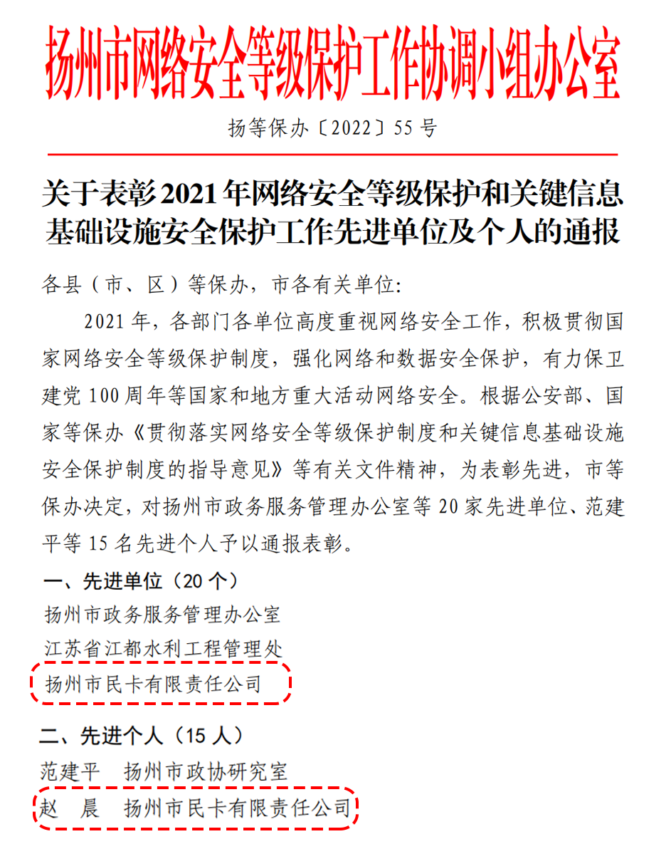 近日,揚(yáng)州市民卡公司被揚(yáng)州市網(wǎng)絡(luò)安全等級保護(hù)工作協(xié)調(diào)小組辦公室評為“2021年網(wǎng)絡(luò)安全等級保護(hù)和關(guān)鍵信息基礎(chǔ)設(shè)施安全保護(hù)工作先進(jìn)單位”,趙晨同志被表彰為“先進(jìn)個人”。