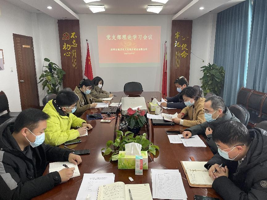 12月14日上午,古城保護公司召開黨支部(擴大)理論學(xué)習(xí)會。公司黨支部書記、董事長梁玉榮主持會議并講話。公司全體員工參加會議。