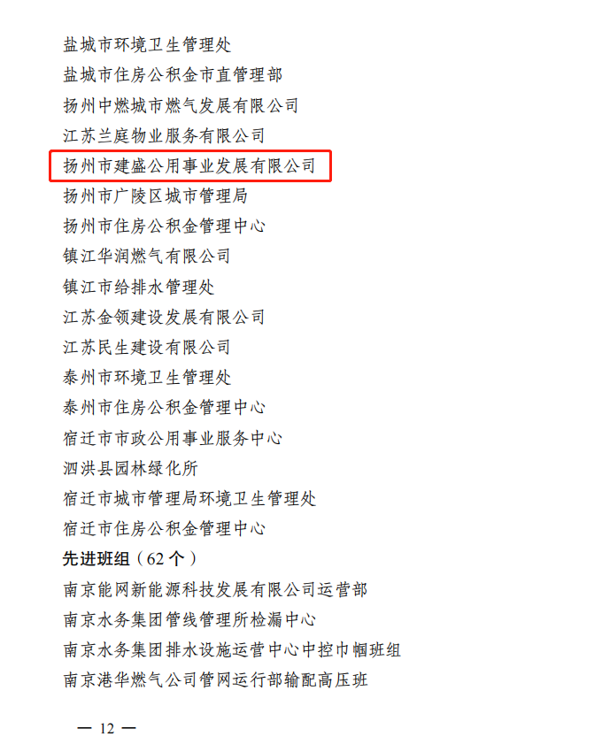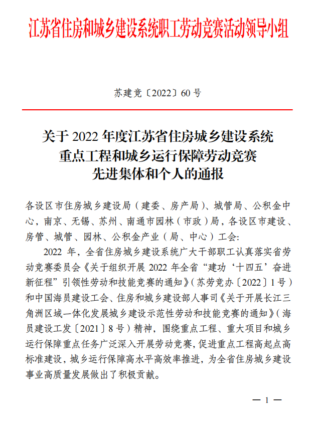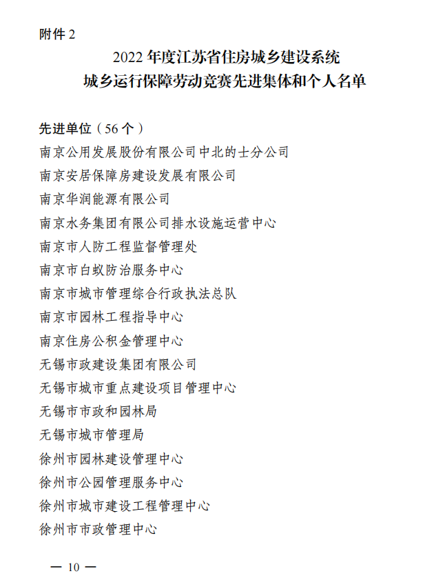 近日,江蘇省住房和城鄉(xiāng)建設(shè)系統(tǒng)職工勞動競賽活動領(lǐng)導(dǎo)小組發(fā)布《關(guān)于2022 年度江蘇省住房城鄉(xiāng)建設(shè)系統(tǒng)重點工程和城鄉(xiāng)運行保障勞動競賽先進集體和個人的通報》,揚州市建盛公用事業(yè)發(fā)展有限公司被授予“2022年度江蘇省住房城鄉(xiāng)建設(shè)系統(tǒng)城鄉(xiāng)運行保障勞動競賽先進單位”光榮稱號。