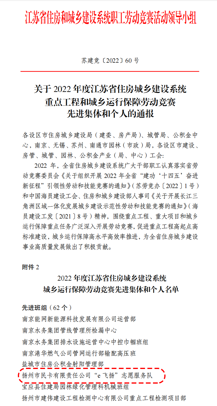 近日,江蘇省住房和城鄉(xiāng)建設系統(tǒng)職工勞動競賽活動領導小組發(fā)布《關于2022 年度江蘇省住房城鄉(xiāng)建設系統(tǒng)重點工程和城鄉(xiāng)運行保障勞動競賽先進集體和個人的通報》,市民卡公司“e 飛揚”志愿服務隊被授予“2022 年度江蘇省住房城鄉(xiāng)建設系統(tǒng)城鄉(xiāng)運行保障勞動競賽先進班組”光榮稱號。