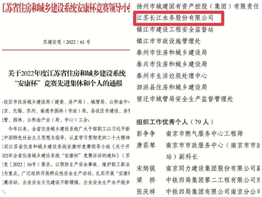 近日,省住建系統(tǒng)安康杯競賽領(lǐng)導(dǎo)小組下發(fā)表彰通報,長江水務(wù)公司榮獲2022年度江蘇省住房和城鄉(xiāng)建設(shè)系統(tǒng)“安康杯”競賽組織工作優(yōu)秀單位稱號。