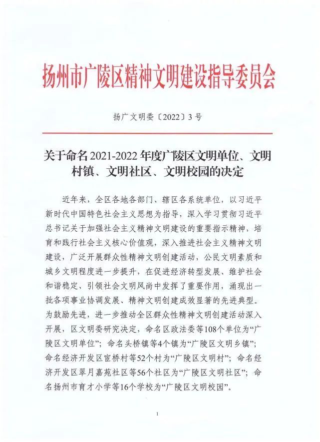 上善公司在集團(tuán)和廣陵區(qū)文明辦的正確指導(dǎo)下,積極探索文明建設(shè)的新思路、新方法,實(shí)現(xiàn)物質(zhì)文明和精神文明的同步提升。近期,廣陵區(qū)文明建設(shè)指導(dǎo)委員會(huì)發(fā)文表彰了2021-2022年度廣陵區(qū)文明單位,上善公司在此次評(píng)選中脫穎而出,被授予該項(xiàng)榮譽(yù)稱號(hào)。