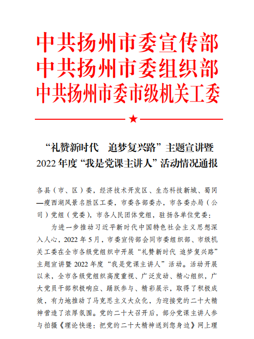近日,市委宣傳部、市委組織部、市級(jí)機(jī)關(guān)工委下發(fā)了《“禮贊新時(shí)代 追夢(mèng)復(fù)興路”主題宣講暨2022年度“我是黨課主講人”活動(dòng)情況通報(bào)》,城控集團(tuán)選送的3名選手——揚(yáng)州市民卡有限責(zé)任公司曹笑、揚(yáng)州供熱有限公司吳俊和揚(yáng)州城建資產(chǎn)管理有限責(zé)任公司林啟迪被評(píng)為2022年度揚(yáng)州市“優(yōu)秀黨課主講人”。