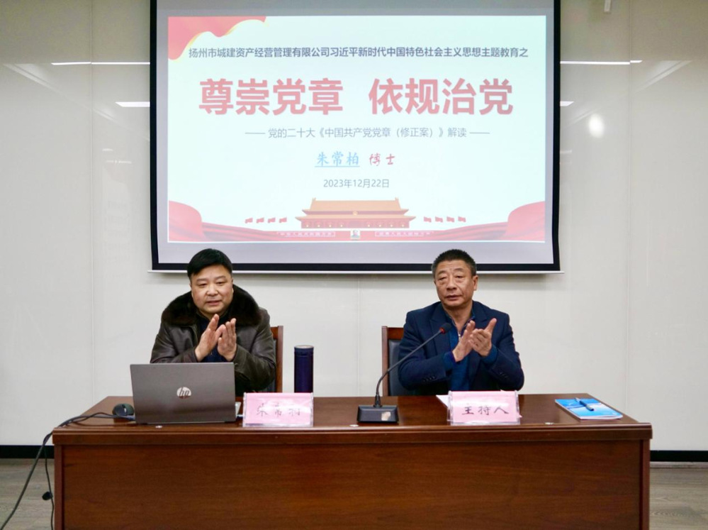 揚(yáng)州大學(xué)法學(xué)博士、副教授、碩士生導(dǎo)師朱常柏博士以《尊崇黨章 依規(guī)治黨》為題,為大家進(jìn)行了學(xué)黨章專題輔導(dǎo),并根據(jù)新修訂的《中國(guó)共產(chǎn)黨章程》,對(duì)“黨章的地位與作用”“黨章的結(jié)構(gòu)與內(nèi)容”“黨章修正若干要點(diǎn)”三個(gè)方面作了重點(diǎn)解讀。朱博士講解風(fēng)格生動(dòng)幽默,內(nèi)容結(jié)構(gòu)脈絡(luò)清晰,理論與實(shí)際相聯(lián)系、歷史與現(xiàn)實(shí)相對(duì)照,引導(dǎo)我們要時(shí)刻做到心中有黨、在黨言黨、對(duì)黨忠誠,進(jìn)一步增強(qiáng)尊崇黨章、遵守黨章、維護(hù)黨章的自覺性和堅(jiān)定性,真正把黨章黨規(guī)內(nèi)化于心、外化于行。