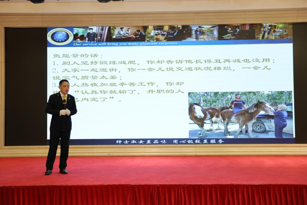 此次培訓(xùn)邀請中國金管家服務(wù)創(chuàng)始人陸飛老師進行授課。他首先分享了與長樂客棧酒店風(fēng)格類似的蘇州等地知名酒店的成功運營模式。隨后,重點圍繞“如何提升服務(wù)質(zhì)量”和“如何打造特色餐飲服務(wù)”兩方面,通過案例分析、現(xiàn)場問答等方式,對酒店服務(wù)意識提升、酒店形象塑造、服務(wù)溝通技巧、餐飲擺臺設(shè)計和出品設(shè)計等內(nèi)容進行了深入淺出的講解。