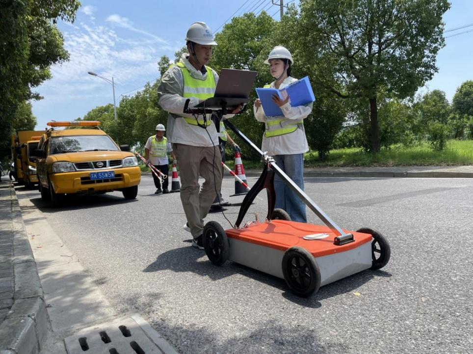 休息片刻,消退些暑熱后,楊帆利用雷達(dá)探測(cè)設(shè)備,給附近路面“拍CT”。不遠(yuǎn)處,樹(shù)蔭下乘涼的幾位居民好奇地張望,似乎想來(lái)湊熱鬧,可又舍不得陰涼。楊帆介紹,由于地下管網(wǎng)錯(cuò)綜復(fù)雜,水流滲漏沖刷泥土?xí)斐傻叵驴斩?,給市民出行帶來(lái)安全隱患。“我們公司專門引進(jìn)了先進(jìn)的雷達(dá)探測(cè)設(shè)備,定期對(duì)道路進(jìn)行‘體檢’,及時(shí)消除安全隱患”。楊帆一路走去,后背的道道鹽霜格外醒目。