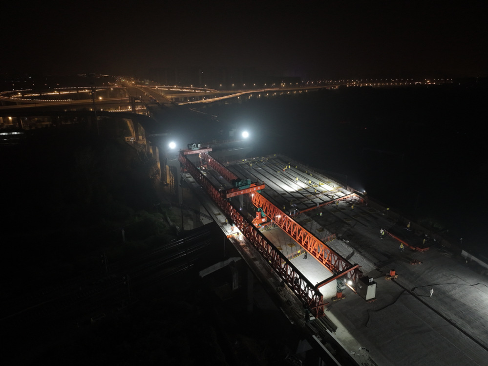 運河北路項目上跨寧啟鐵路,其中關(guān)鍵節(jié)點鐵路跨,單片預(yù)制箱梁跨度達45米,重量220噸,共14片,施工難度大,鐵路管控安全風(fēng)險高。為確保寧啟鐵路運營安全及施工安全,萬福公司超前謀劃、精心組織,提前申請9月2日-7日鐵路“天窗點” ,與南京上鐵、江蘇雷威、新長工務(wù)段、南京供電段等單位通力合作,充分利用該階段每晚23點至次日凌晨3點趕搶箱梁架設(shè)進度,共歷時6個夜晚順利完成上跨寧啟鐵路主跨箱梁架設(shè)施工。