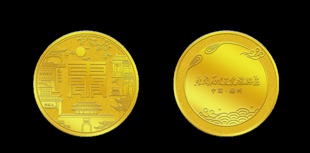 紀念章的寓意:1.月下東關款(月下東關):以東關街魚骨狀的布局為切入點,將東關街兩側重要景點都融合在一個畫面中,整體布局還原了東關街魚骨狀的特點。將東門遺址作為核心元素,放置在紀念幣的中軸線上,左側的景點按照實際從東到西的景點位置進行放置分別是謝馥春、壺園、長樂客棧以及長樂客棧中的含藻亭。右側的景點從東到西分別是東關古渡、個園、逸圃以及張玉良紀念館。此款紀念幣為金幣款。