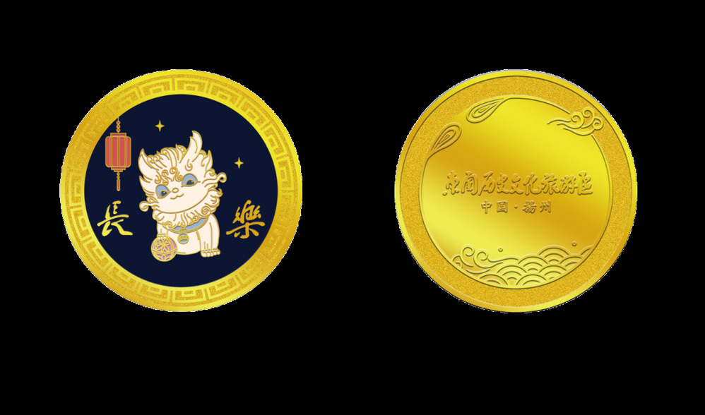 4.長樂客??睿ㄖ汩L樂):此款紀念幣面向 80、90 后與 00 后,取長樂客棧門前的歪頭石獅子雕塑進行二次創(chuàng)作進行,風格偏俏皮可愛。取李長樂將軍的名字后兩字“長樂”作為紀念幣的主題。長樂的意思是永久快樂。出自于《韓非子·功名》,“以尊主御忠臣,則長樂生而功名成?!?此款紀念幣的設計初衷,是希望在生活中保持一個孩童之心,以平常心對待生活,則能永遠快樂。邊框設計則采用的是東門遺址城門上的花紋。填色取月下東關的意境,為東關街的夜景。以深藍色為底色,紅色燈籠為補色,整體風格偏童趣。