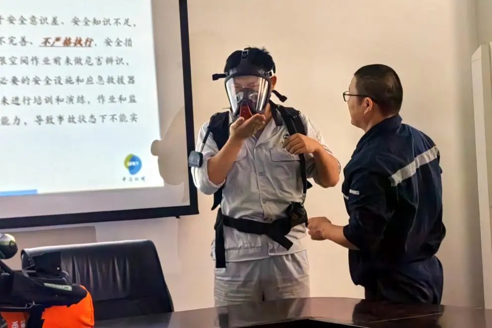 除了理論知識的講解,培訓還增加了安全防護設(shè)施的穿戴實操環(huán)節(jié),員工們親身體驗了正壓式空氣呼吸器的穿戴和使用。通過實操學習,員工們不僅掌握了正確的穿戴方法,還深刻體會到了安全防護設(shè)施在保障人身安全方面的重要作用。