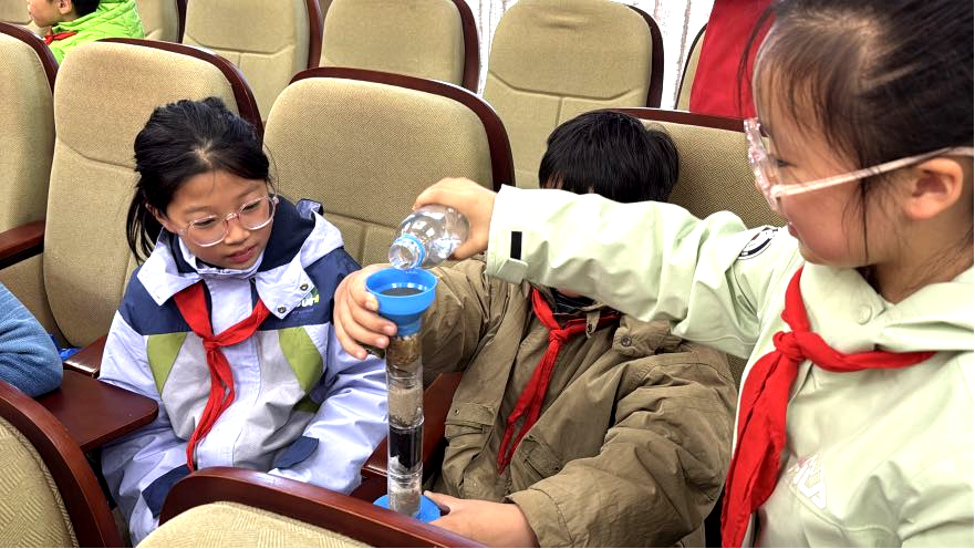 隨著過濾裝置制作完成,小記者們將臟水緩緩倒入過濾器,緊盯著水流經(jīng)過每一層過濾材料,經(jīng)過實(shí)驗(yàn)裝置的處理,原本渾濁的臟水逐漸變得清澈透明?!巴郏娴淖兦辶?!”當(dāng)清澈的水從過濾器底部緩緩流出時(shí),不少同學(xué)驚呼出聲,臉上洋溢著喜悅的笑容?!拔矣X得這個(gè)實(shí)驗(yàn)太神奇了!沒想到經(jīng)過簡(jiǎn)單的幾個(gè)步驟,就讓水質(zhì)有了明顯改善?!泵穾X小學(xué)四(10)班的劉同學(xué)激動(dòng)地說道。小記者們紛紛表示,此次科普活動(dòng)不僅讓他們了解了飲用水安全的重要性,還在實(shí)踐中培養(yǎng)了觀察、思考和動(dòng)手的能力。在活動(dòng)的最后,現(xiàn)場(chǎng)進(jìn)行了有獎(jiǎng)問答環(huán)節(jié),小記者們都非常踴躍地回答問題,大家對(duì)于制水、凈水、節(jié)水,都有了更加深刻的理解。