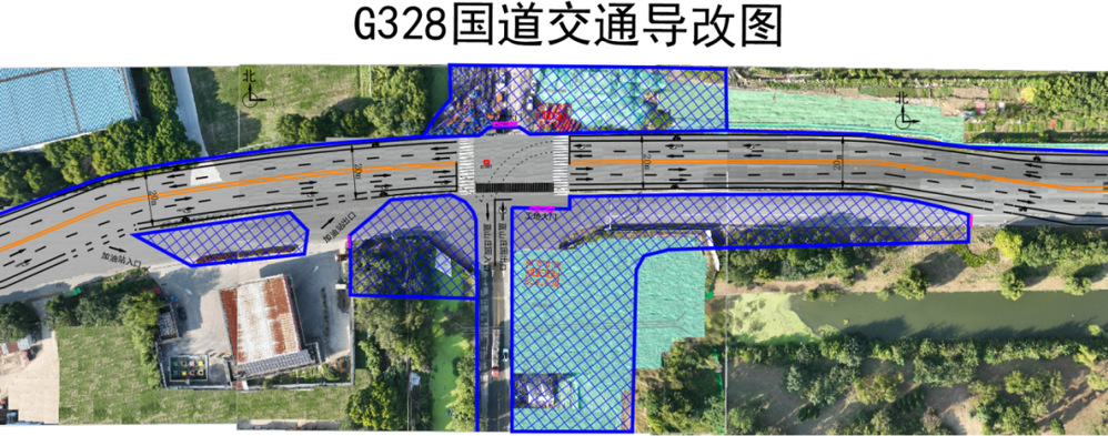 為保障潤(rùn)揚(yáng)南路快速化改造工程施工順利進(jìn)行,確保工程施工期間安全暢通,自2024年12月22日起至2025年4月30日止,對(duì)G328國(guó)道與潤(rùn)揚(yáng)南路交叉口相關(guān)路段實(shí)施臨時(shí)導(dǎo)改,導(dǎo)改道路長(zhǎng)度約450米,第一階段導(dǎo)改整體向北平移約9米,維持雙向四車(chē)道交通布局,兩端以彎道形式平穩(wěn)順接至既有道路。