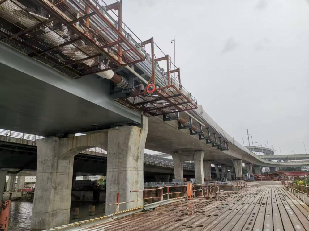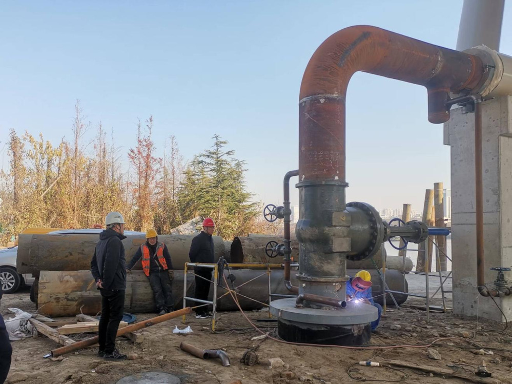此次隨橋敷設(shè)的供熱管道是東南主干線(三期)一標(biāo)段供熱管道建設(shè)的重要節(jié)點(diǎn)和難點(diǎn),更是“互聯(lián)互通”的最后一環(huán)。隨橋敷設(shè)的管道采用DN600管徑,長(zhǎng)約380米。項(xiàng)目建設(shè)初期,項(xiàng)目組積極與大橋建設(shè)、施工單位對(duì)接。考慮到橋體設(shè)計(jì)情況,經(jīng)過雙方設(shè)計(jì)和技術(shù)人員充分溝通,決定采用鋼結(jié)構(gòu)支架隨橋敷設(shè),布置位置為利用預(yù)應(yīng)力混凝土連續(xù)箱梁和鋼箱梁梁側(cè)生根。為保證橋面安全,施工過程中對(duì)每一道焊縫按規(guī)范要求進(jìn)行了無(wú)損檢測(cè),熱力管道的垂直荷載及軸向荷載均滿足該橋設(shè)計(jì)荷載要求。