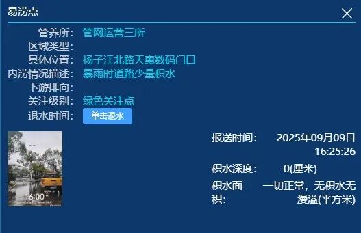 公司依托“城排通”智慧管理,對管網(wǎng)運行狀態(tài)進行實時監(jiān)測。在關(guān)鍵節(jié)點安裝雨量傳感器、流量計、液位計等感知設(shè)備收集雨情、水情、管網(wǎng)液位等數(shù)據(jù),及時上傳至管理平臺,一旦數(shù)據(jù)超出預(yù)警閾值,系統(tǒng)自動報警,快速定位,為防汛決策提供科學依據(jù)。通過平臺,可遠程調(diào)度應(yīng)急設(shè)備與人員,實時查看重點點位現(xiàn)場情況,實現(xiàn)精準指揮,使防汛從“被動處置”轉(zhuǎn)向“主動預(yù)警”,大大提高了防汛工作效率。同時,公司注重歷次雨后復(fù)盤,使用“城排通”系統(tǒng)防汛板塊及時進行雨后總結(jié),盯準薄弱環(huán)節(jié),及時完善應(yīng)對策略,為后續(xù)更好地開展防汛工作打牢基礎(chǔ)。