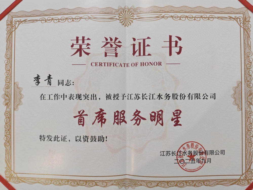 如今,公司授予李青“長(zhǎng)江水務(wù)首席服務(wù)明星”榮譽(yù)稱號(hào),這不僅是對(duì)他三十余載在一線崗位默默耕耘、無(wú)私奉獻(xiàn)的充分肯定,更是對(duì)他始終堅(jiān)守初心、踐行服務(wù)為民宗旨崇高精神的最高贊譽(yù)。這份榮譽(yù)不僅彰顯了李青個(gè)人的成就,更凝聚著全體水務(wù)一線員工的辛勤付出。