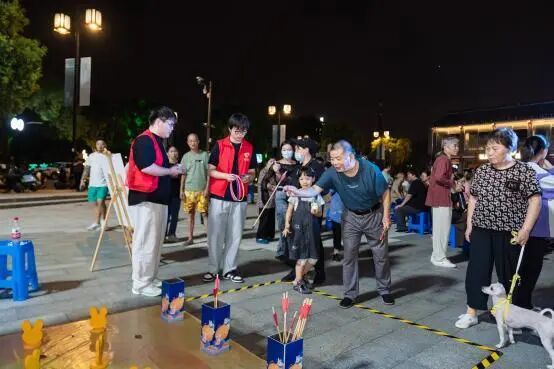 除了文化雅韻,現(xiàn)場設置了多個互動打卡與市集體驗區(qū),讓節(jié)日氛圍更添煙火氣?!拔以谛炷拊铝痢贝蚩c前,居民手持造型精巧的月亮小夜燈定格溫馨瞬間;“玉兔投壺”游戲區(qū)排起長隊,老少同樂間復刻古代士人的閑情雅趣?!霸鹿馐屑眳R集文創(chuàng)手作、中秋美食等,市民憑游園卡完成互動、集齊印章,即可兌換月亮小夜燈和冰皮月餅,將節(jié)日祝?;饔|手可及的溫暖。