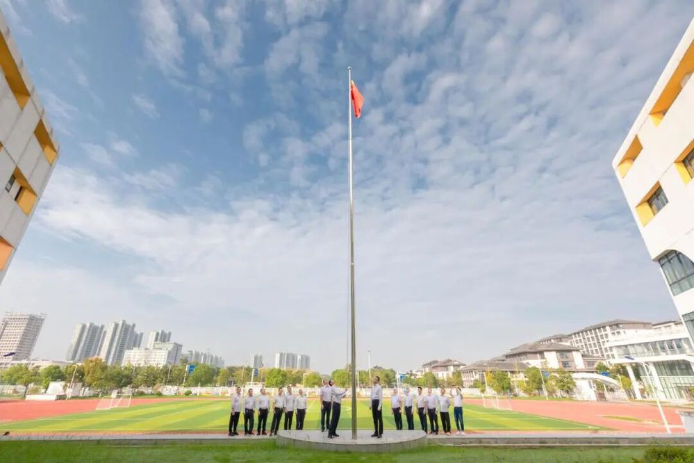 上午8時整,儀式正式開始。三名護旗手邁著鏗鏘有力、整齊劃一的步伐,護衛(wèi)著鮮艷的五星紅旗走向升旗臺?!跋驀臁炊Y!”的口令響起,伴隨著雄壯激昂的《義勇軍進行曲》,五星紅旗迎風展開,在全場人員深情的注目禮中冉冉升起,直至頂端迎風飄揚。這一刻,莊嚴而神圣,濃濃的愛國情懷和自豪感在每個人心中油然而生。