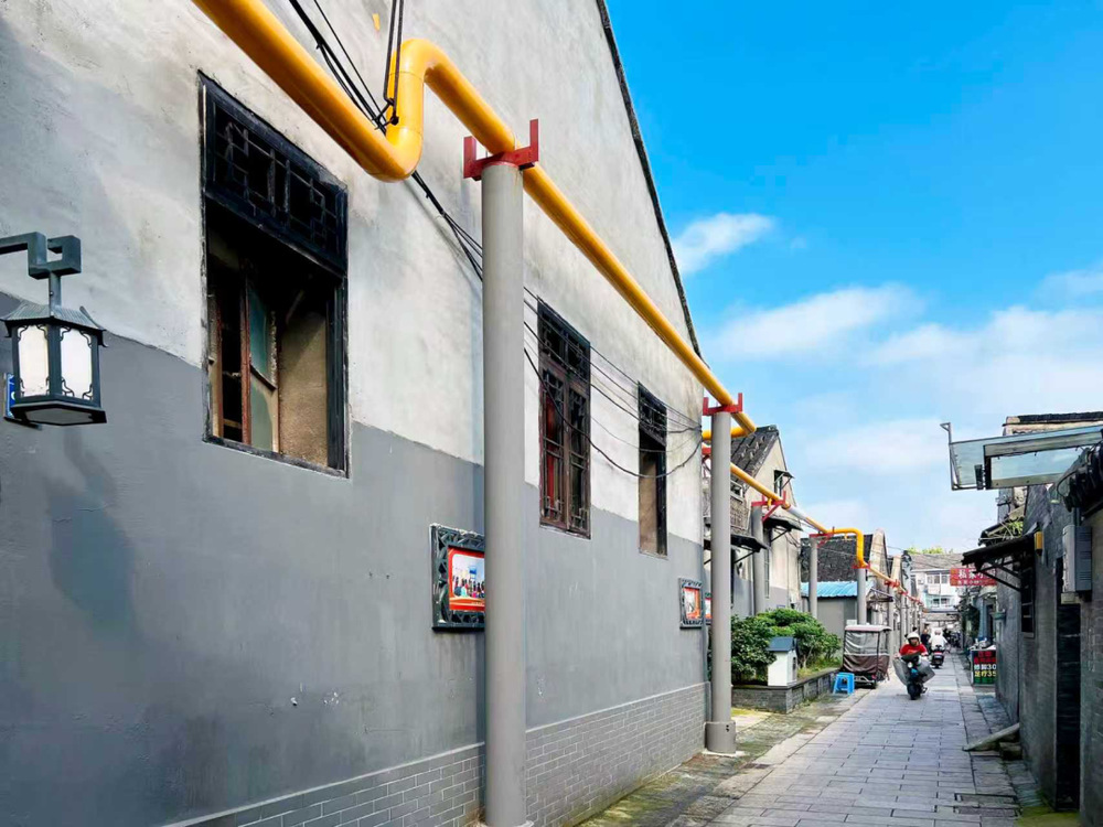 該方案通過精心設(shè)計與計算,在無法沿墻敷設(shè)管道的狹窄空間內(nèi),采用設(shè)立專用鋼結(jié)構(gòu)立柱的方式,將燃氣管道穩(wěn)固地架設(shè)起來,如同為管道建造了“空中走廊”。這一方法有效規(guī)避了老建筑墻體承重不足、巷道過窄等限制,既保障了管道的安全穩(wěn)固,又最大程度減少了對原有建筑結(jié)構(gòu)和街巷風貌的影響。
