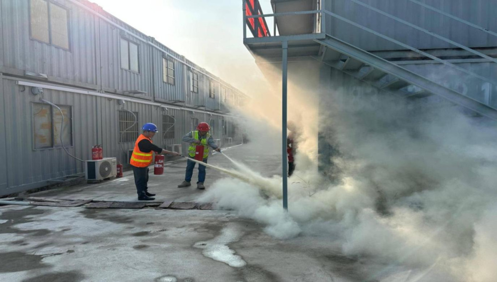 本次培訓邀請消防安全專家進行授課。演練前,專家詳細講解了火災報警流程、初期火災撲救技巧、疏散逃生注意事項等核心知識,重點演示了滅火器“提、拔、握、壓”的正確操作方法,同時明確了疏散引導員、滅火行動組的職責分工,劃定了安全疏散路線和集合區(qū)域。下午2時30分,演練正式啟動。模擬火情信號發(fā)出后,集裝箱板房內(nèi)煙霧彌漫,現(xiàn)場立即啟動應急響應預案。疏散引導員迅速組織員工用濕毛巾捂住口鼻,彎腰低姿沿預定路線快速、有序撤離至指定安全區(qū)域;滅火行動組攜帶滅火器、消防水帶等器材,第一時間趕赴“火情”現(xiàn)場,對著火點實施精準撲救。